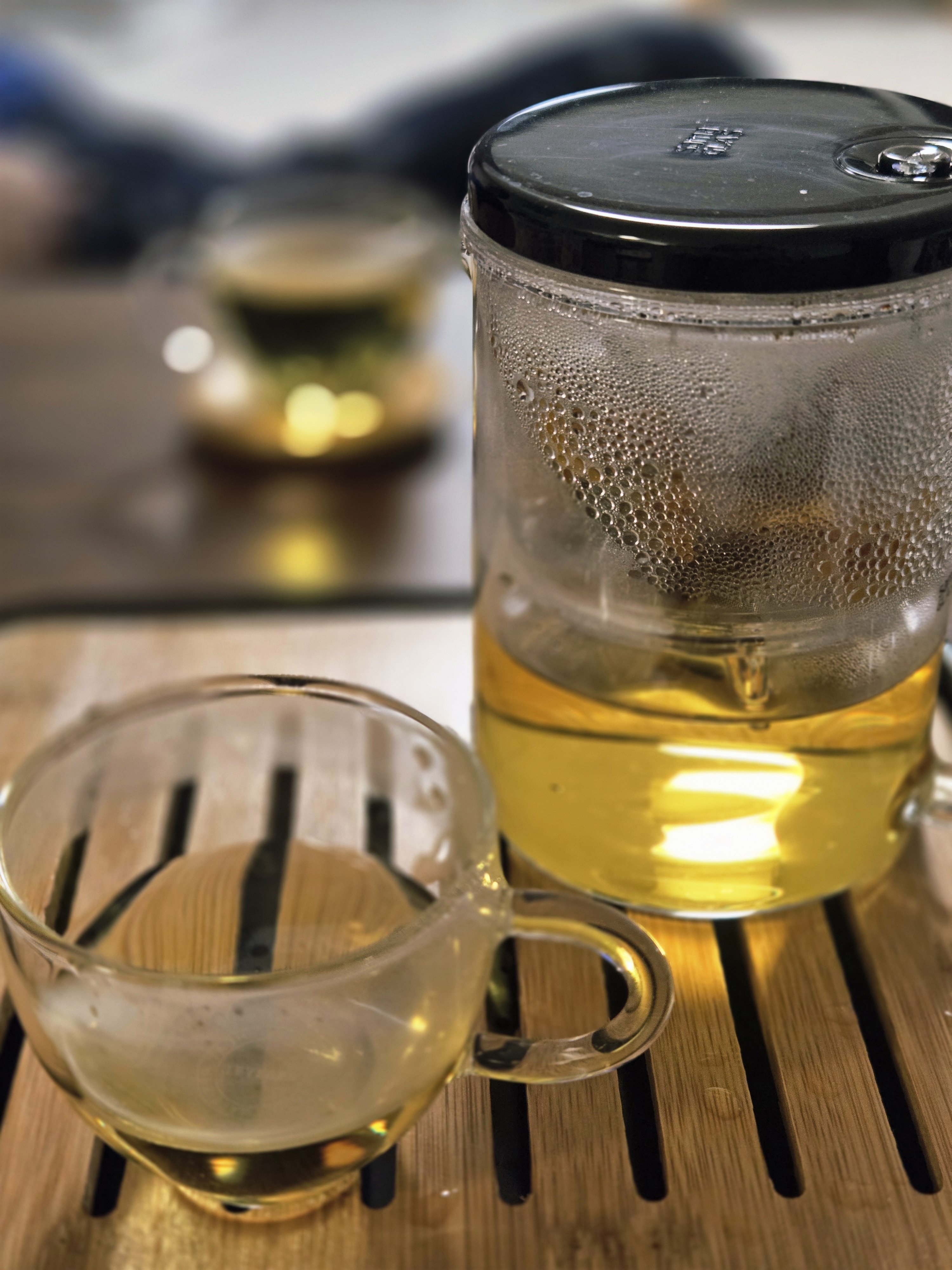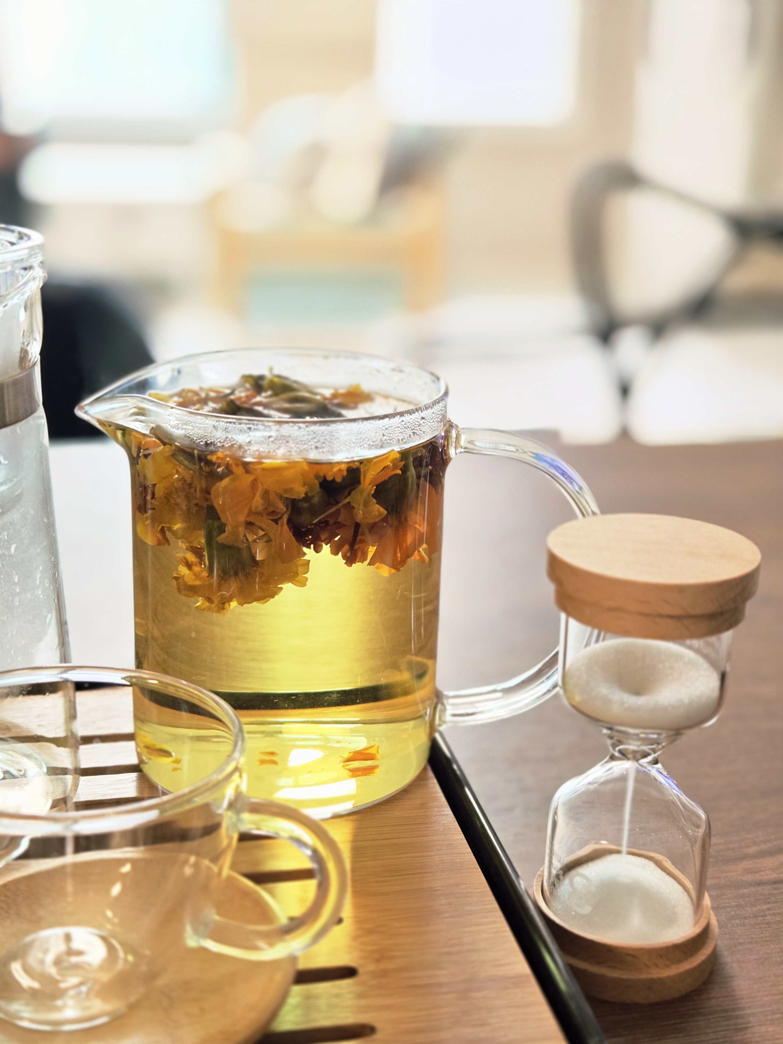 투명한 티팟에 따뜻한 물을 붓자